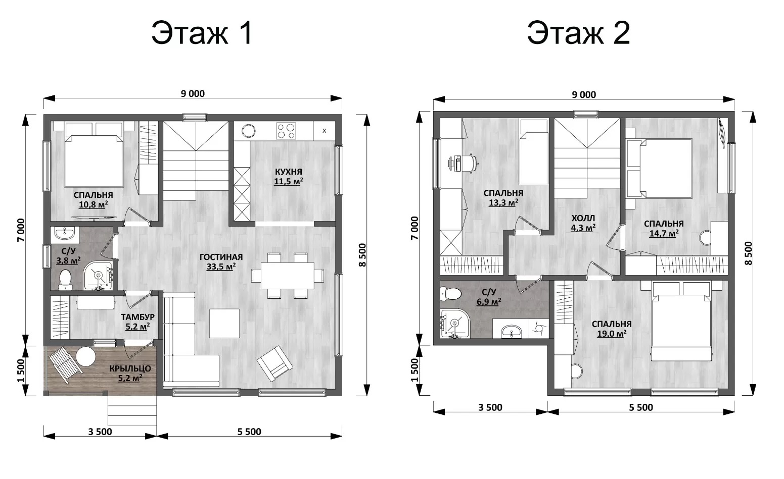 Каркасная конструкция дома обеспечивает прочность и долговечность, а также отличные теплоизоляционные характеристики, что позволяет сохранять тепло зимой и прохладу летом. Легкость в монтаже и экономия времени на строительстве — важные преимущества этого проекта.