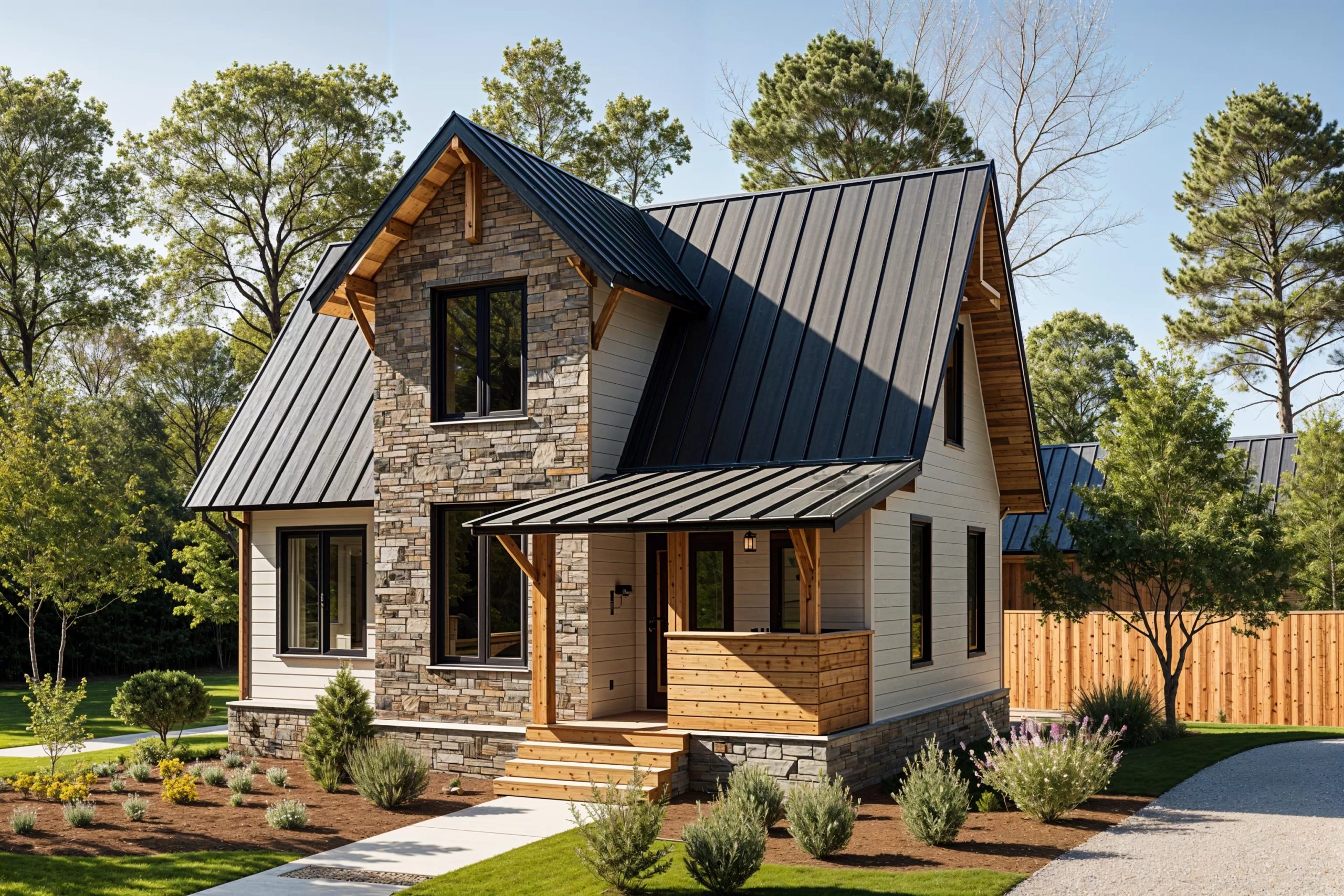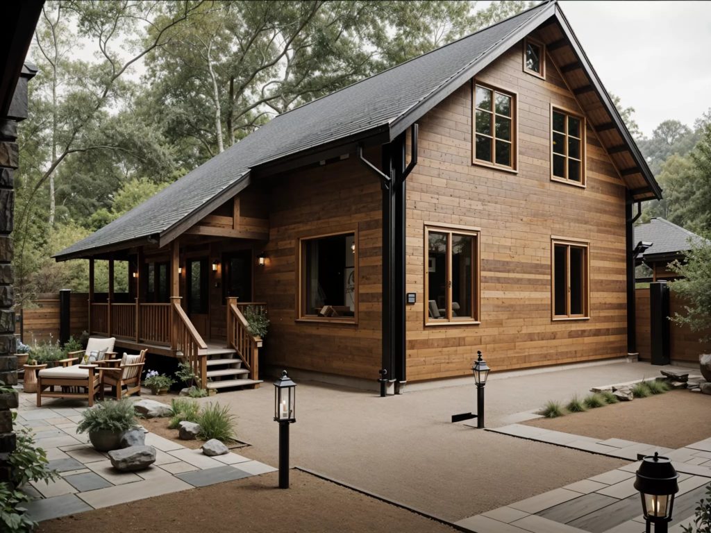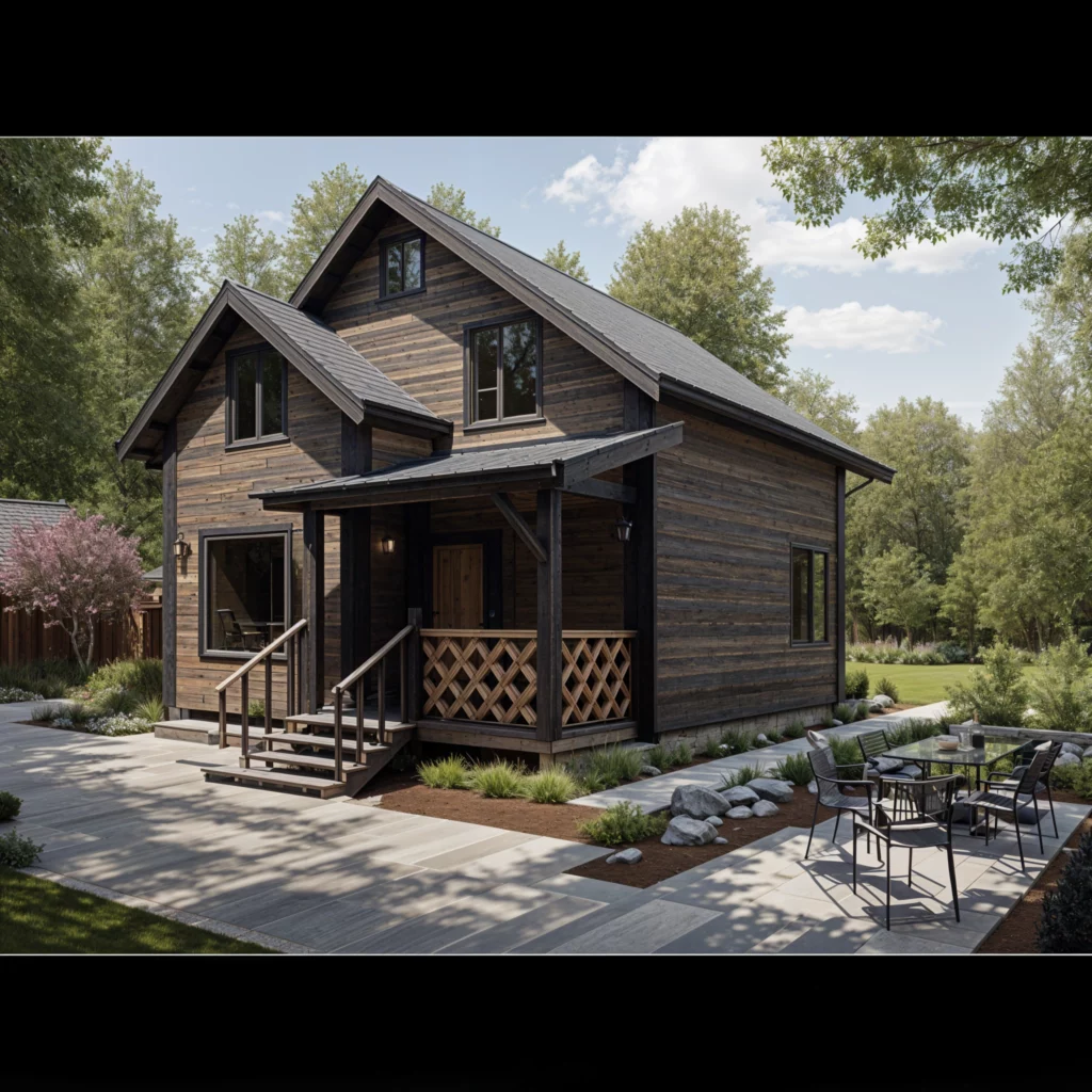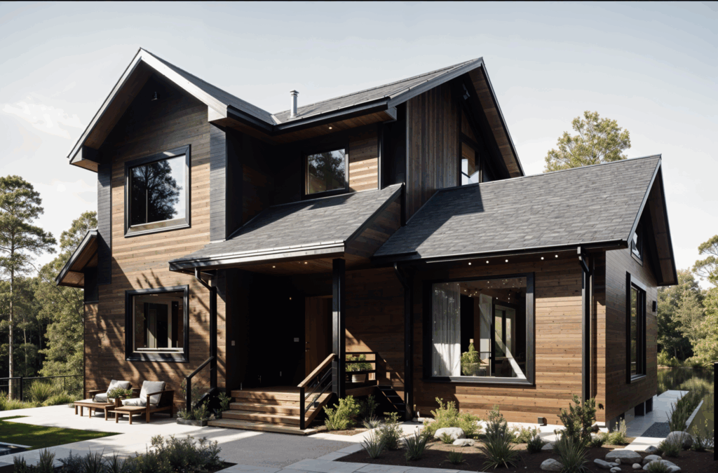Для отделки используется натуральное дерево в сочетании с современными материалами. Фасад дома облицован сайдингом, имитирующим структуру дерева, что придает ему элегантный и стильный вид. Внутренняя отделка выполнена в скандинавском стиле с использованием светлых оттенков и натуральных материалов.